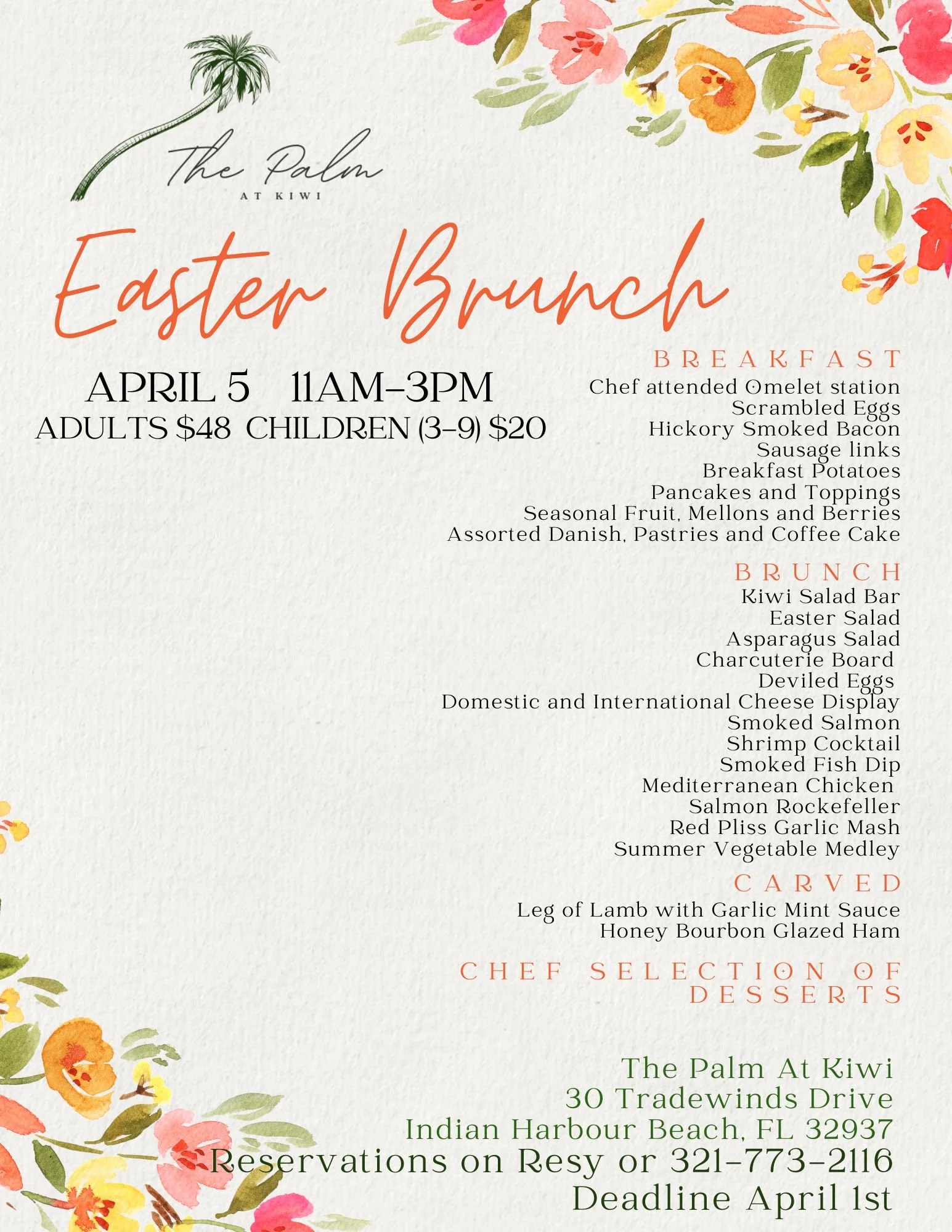 Back to All Events Easter Brunch Sunday, April 5, 2026 11:00 AM 3:00 PM Kiwi Racquet and Fitness Club 30 Tradewinds Drive Satellite Beach, FL, 32937 United States (map) Google Calendar ICS Join us for Easter Brunch on April 5, offering tables between 11 AM and 3 PM. Please call to make your reservations by April 1, 2026 on RESY.com or 321.773.2116. Hoppy Easer!