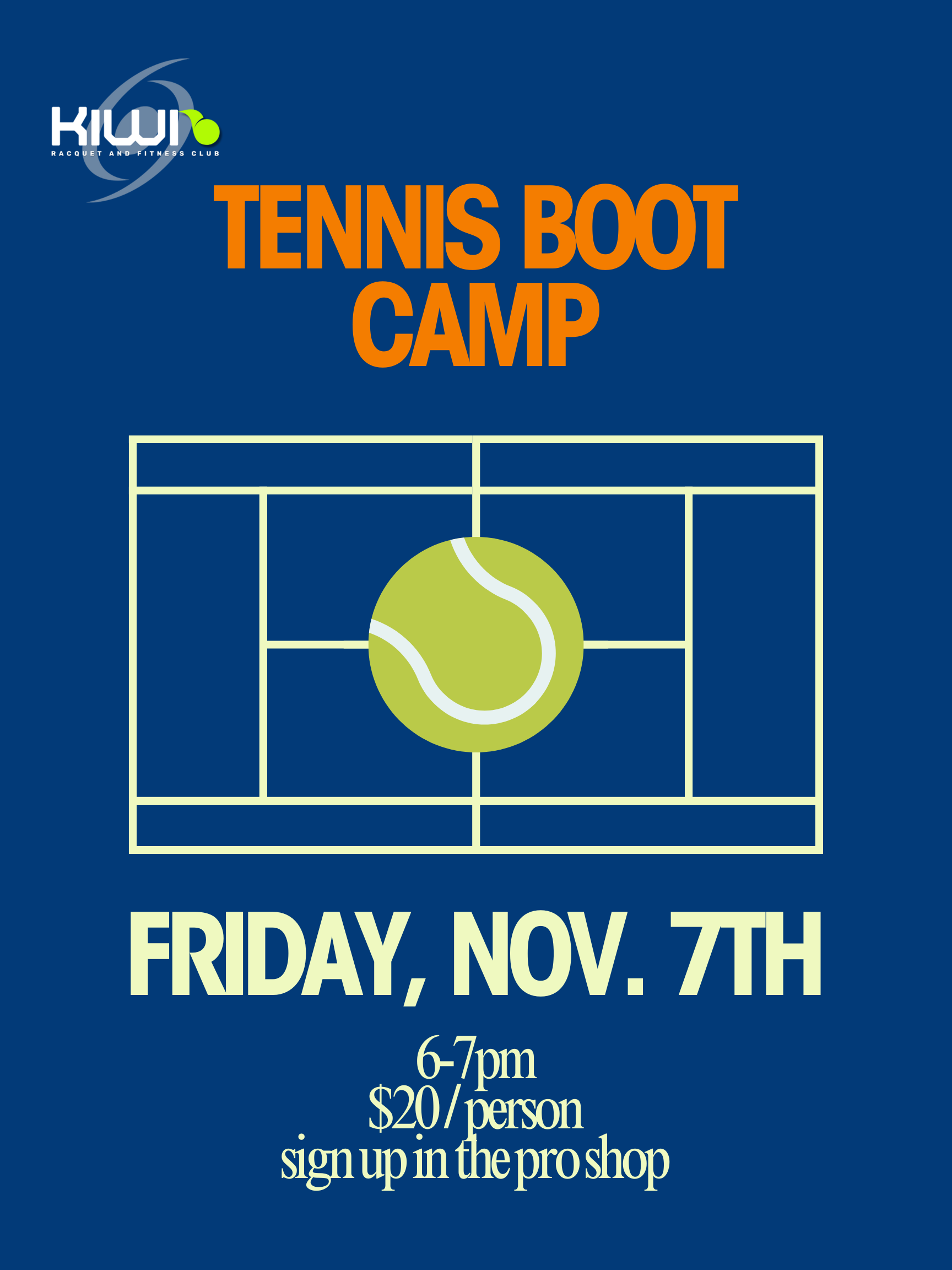 Boot Camp Friday, November 7, 2025 6:00 PM 9:00 PM Kiwi Racquet and Fitness Club 30 Tradewinds Drive Satellite Beach, FL, 32937 United States (map) Google Calendar ICS Sign up in the pro shop for a night of fitness. Joe Romanelli and Pro Ruben Vanoppen will be leading boot camp at 6 PM on Friday night. The cost is $20 per person. Please sign up in the pro shop, or call us at 321.773.2116 Stay after for a Pro tennis exhibition at 7 PM