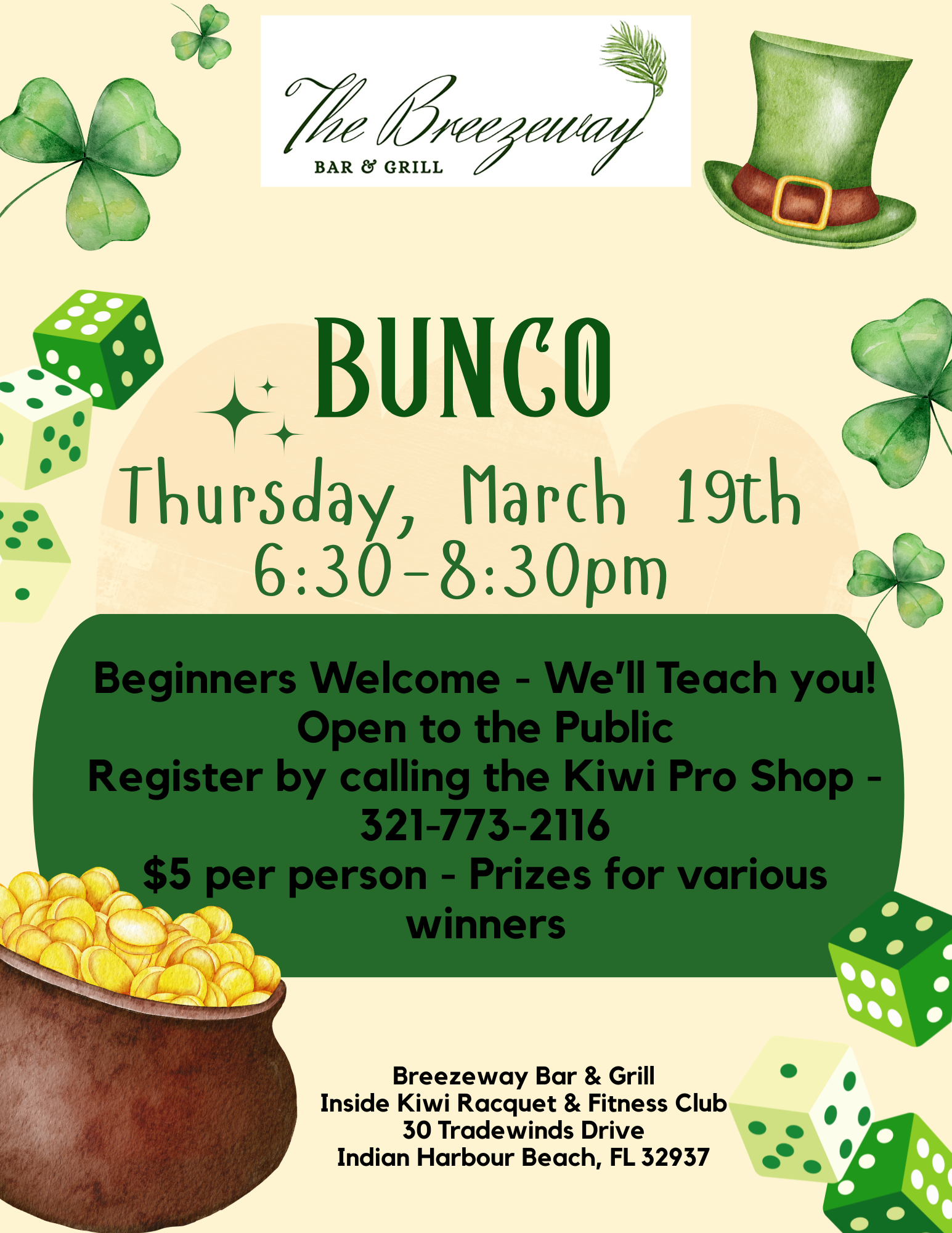 Join us for a fun night of Bunco. Register in the Pro Shop. Cost is $5 per person with prizes for various winners.