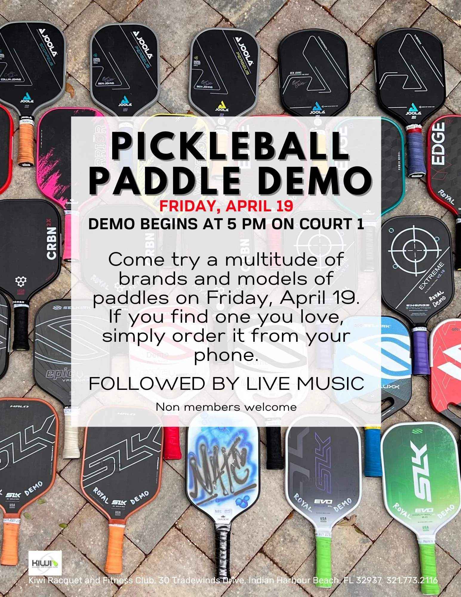Come try over 40 different types and brands of pickleball paddles. If you fall in love, scan the demo code and order from your phone. You will receive it in about 2 days!