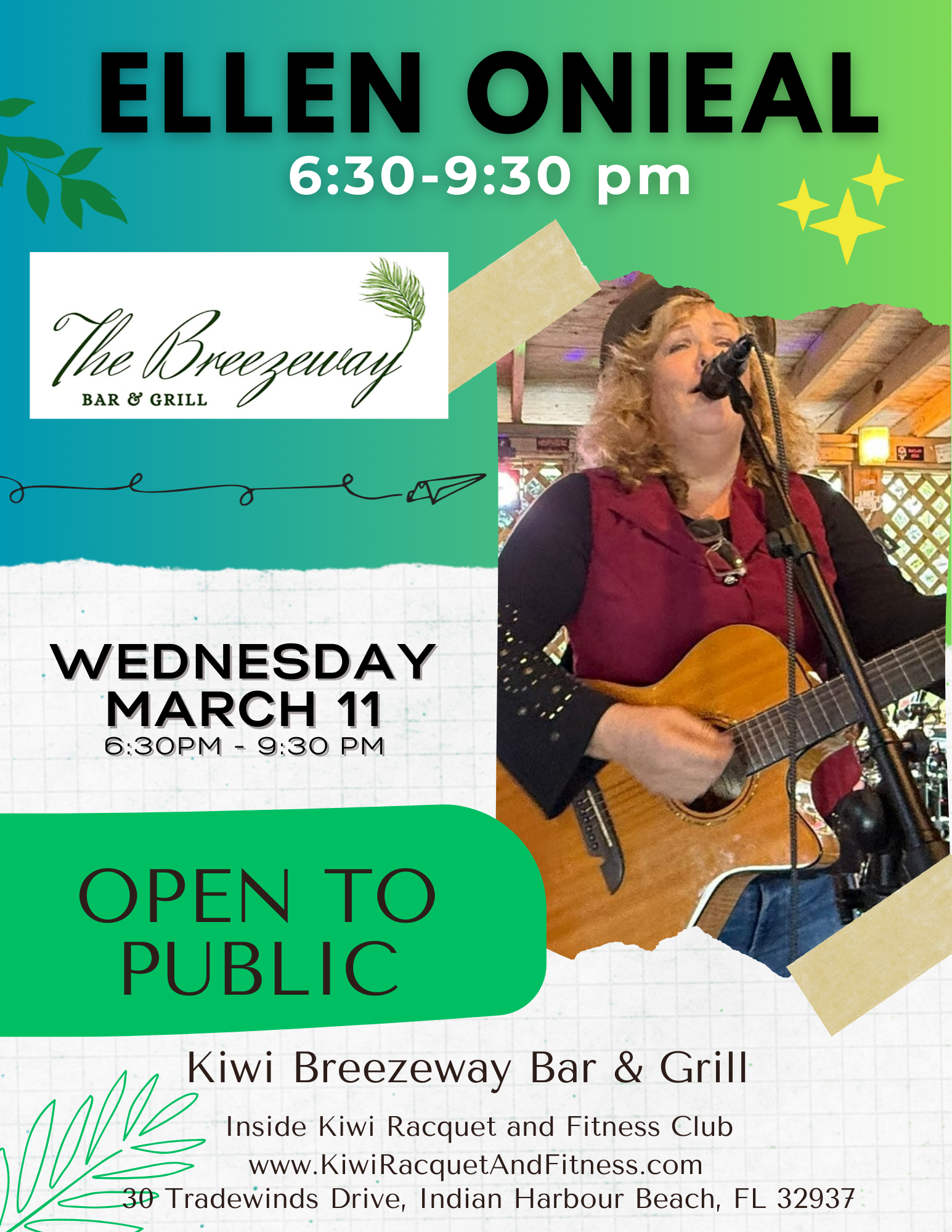 Back to All Events Ellen ONieal Wednesday, March 11, 2026 6:30 PM 9:30 PM Kiwi Racquet and Fitness Club 30 Tradewinds Drive Satellite Beach, FL, 32937 United States (map) Google Calendar ICS Ellen ONieal will be playing in the breezeway from 6:30 PM to 9:30 PM. We serve dinner during that time at The Kiwi Palm and the Kiwi Breezeway Bar and Grill.