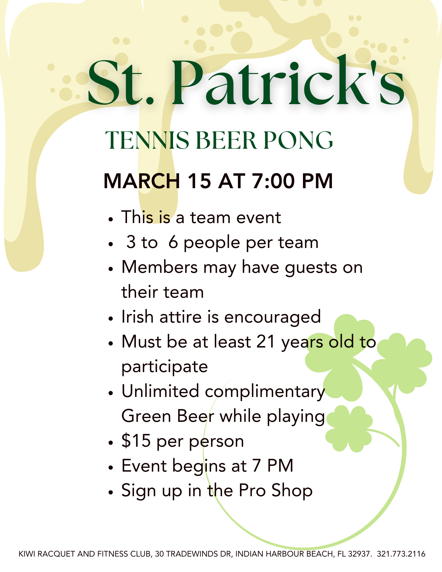 Tennis Beer Pong Friday, March 15, 2024 7:00 PM 10:30 PM Google Calendar ICS Happy St. Patrick’s Day! Play beer pong, and drink green beer for free while you play. Sign up for $15 per person in the Pro Shop. We will have courts 3 and 4 set for play at 7:00 PM.