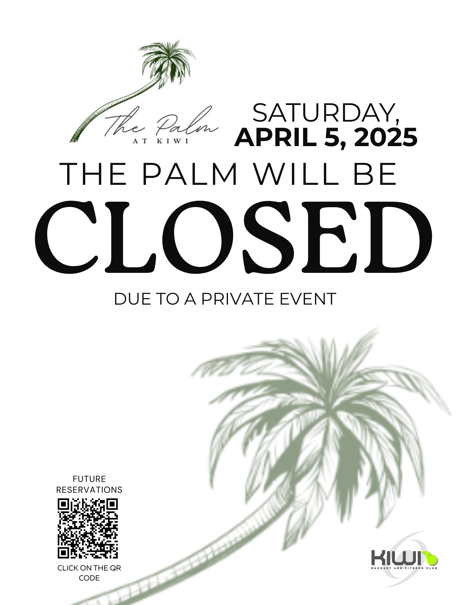 Back to All Events The Palm Special Hours Saturday, April 5, 2025 9:00 AM 9:30 PM 30 Tradewinds Drive Satellite Beach, FL, 32937 (map) Google Calendar ICS The Palm will be closed on Saturday, April 5, 2025 for a special event. Thank you for your understanding. Please make your future reservations on RESY.com or call 321.773.PALM.