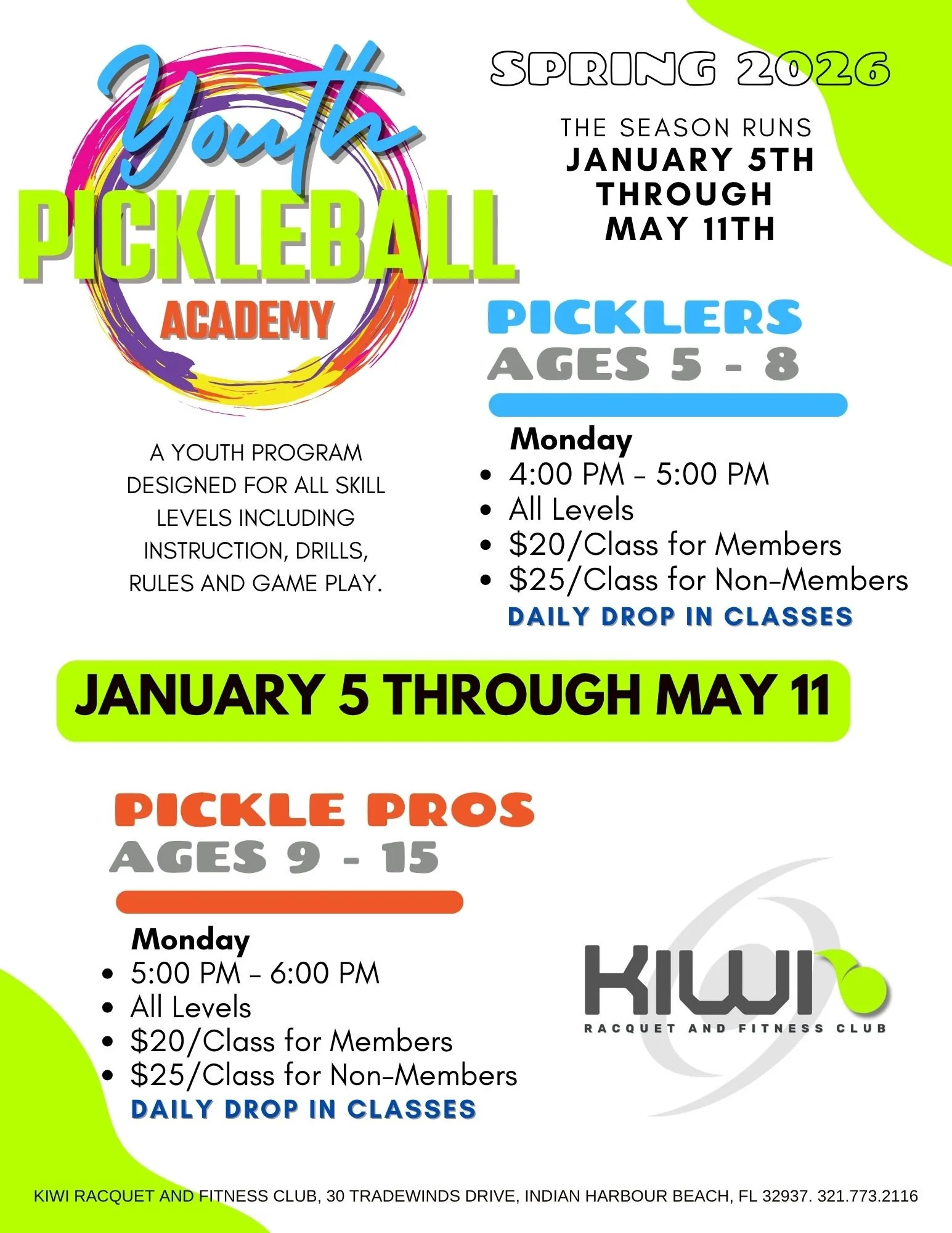 We are excited to offer pickleball classes for all ages, from 5 to 15. Please remember sunscreen, hats/visors, and hydration. We do have water fountains on our courts. Bottled water, snacks, and Power Aide are available for purchase in the Kiwi Pro Shop. THE CLINICSRUN January 5 through May 11, 2026.