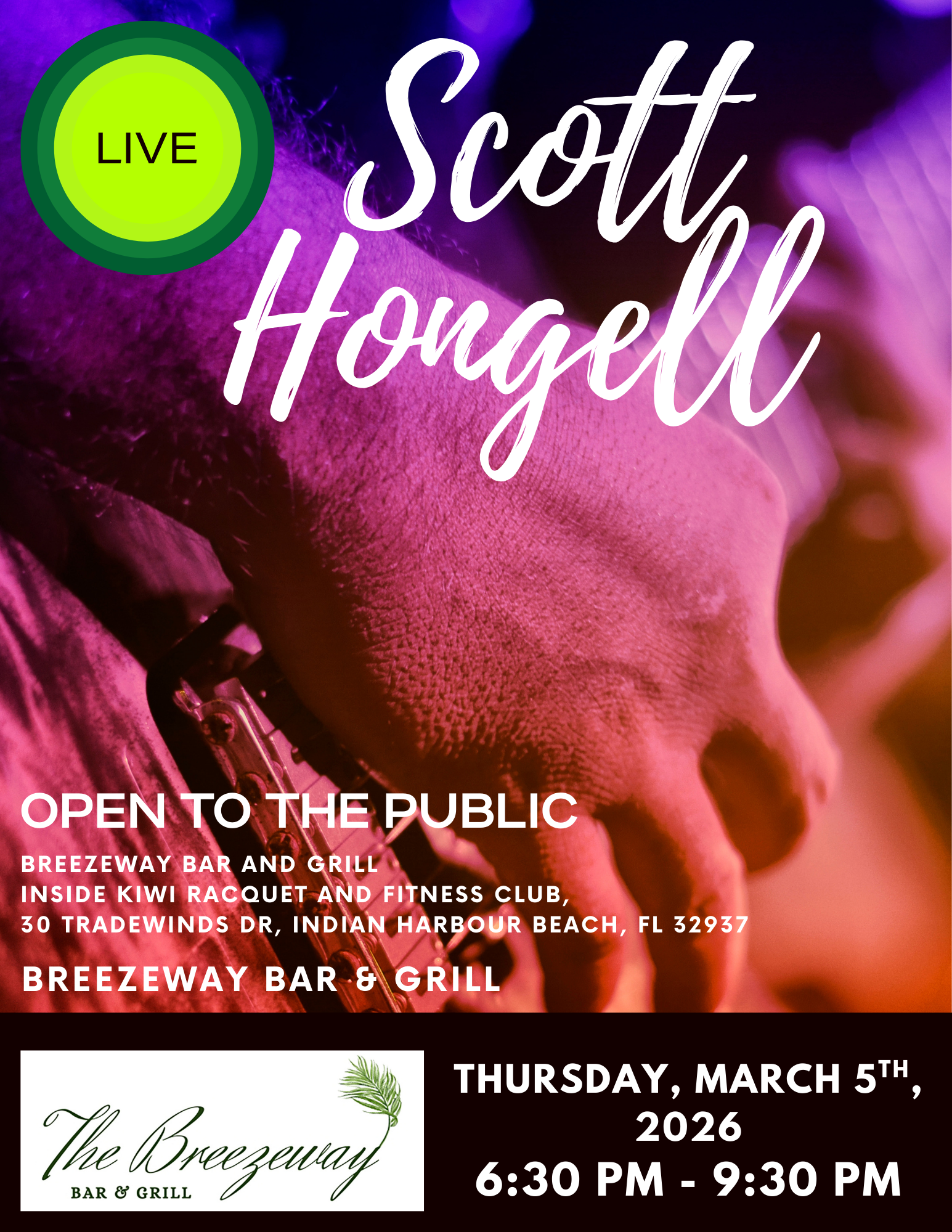 Join us for live music by Scott Hongell in the Breezeway from 6:30 PM to 9:30 PM