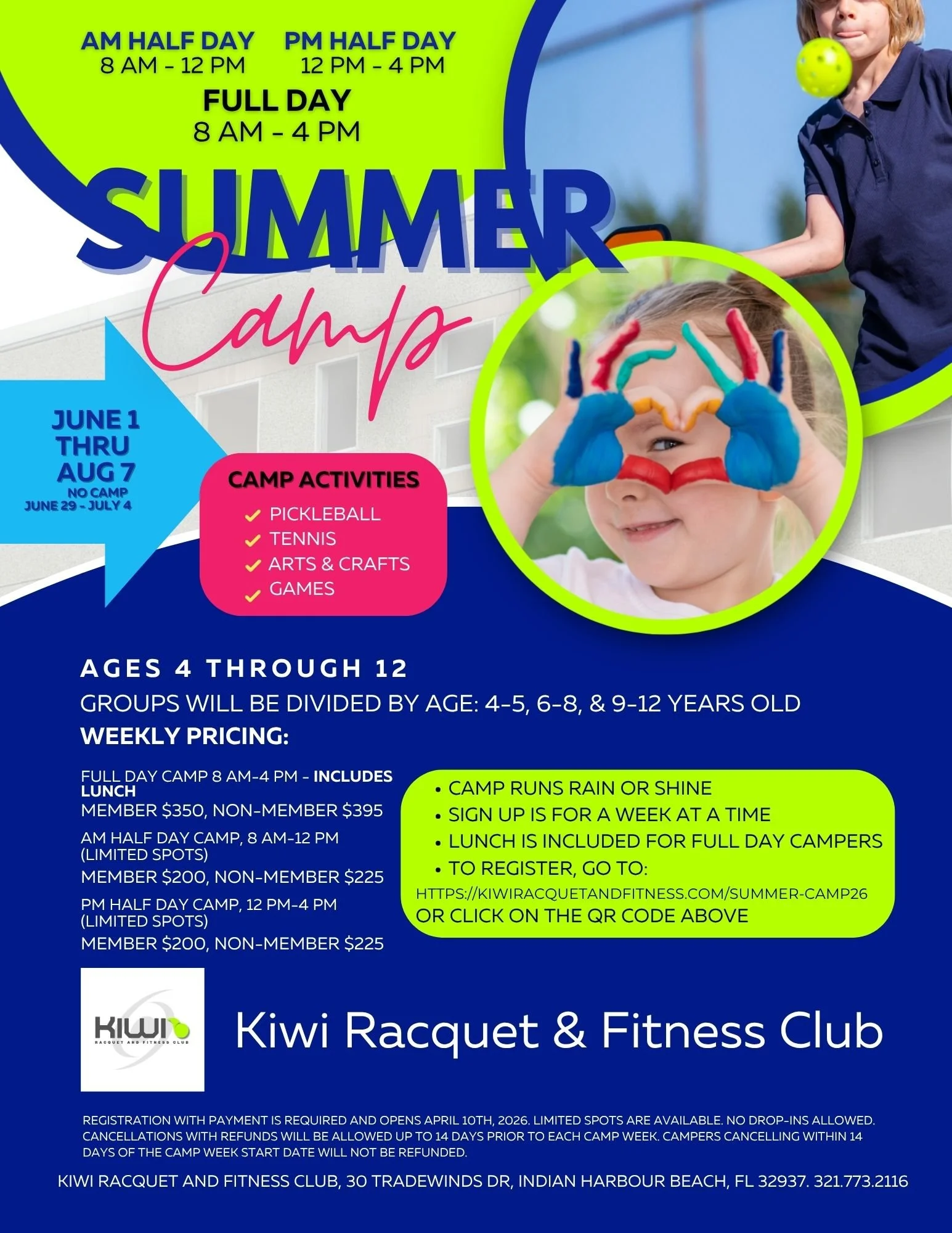 Back to All Events Summer Camp 2026 Monday, June 1, 2026 9:00 PM Friday, August 7, 2026 3:00 PM Kiwi Racquet and Fitness Club 30 Tradewinds Drive Satellite Beach, FL, 32937 United States (map) Google Calendar ICS Summer Camp 2026Are you looking for a fun and active summer camp experience for your child? Look no further than the Kiwi Racquet and Fitness Club's summer camp! Our camp offers a variety of activities to keep your child engaged and entertained all summer.