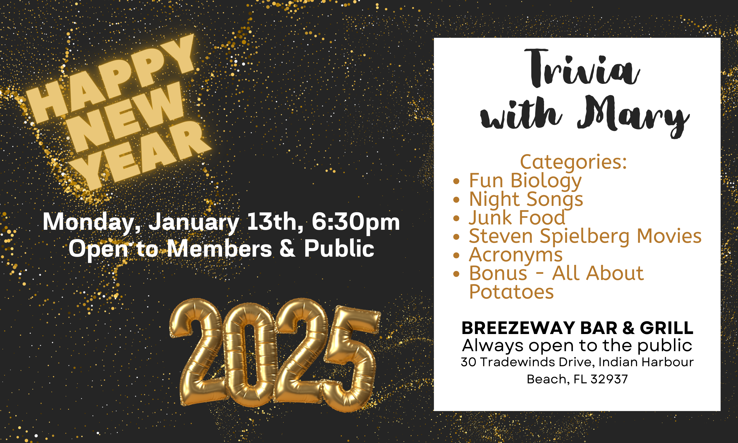 Trivia with Mary Monday, January 20, 2025 6:30 PM 7:30 PM Kiwi Racquet and Fitness Club 30 Tradewinds Drive Satellite Beach, FL, 32937 United States (map) Google Calendar ICS Join us for trivia with Mary in the breezeway at 6:30 PM.
