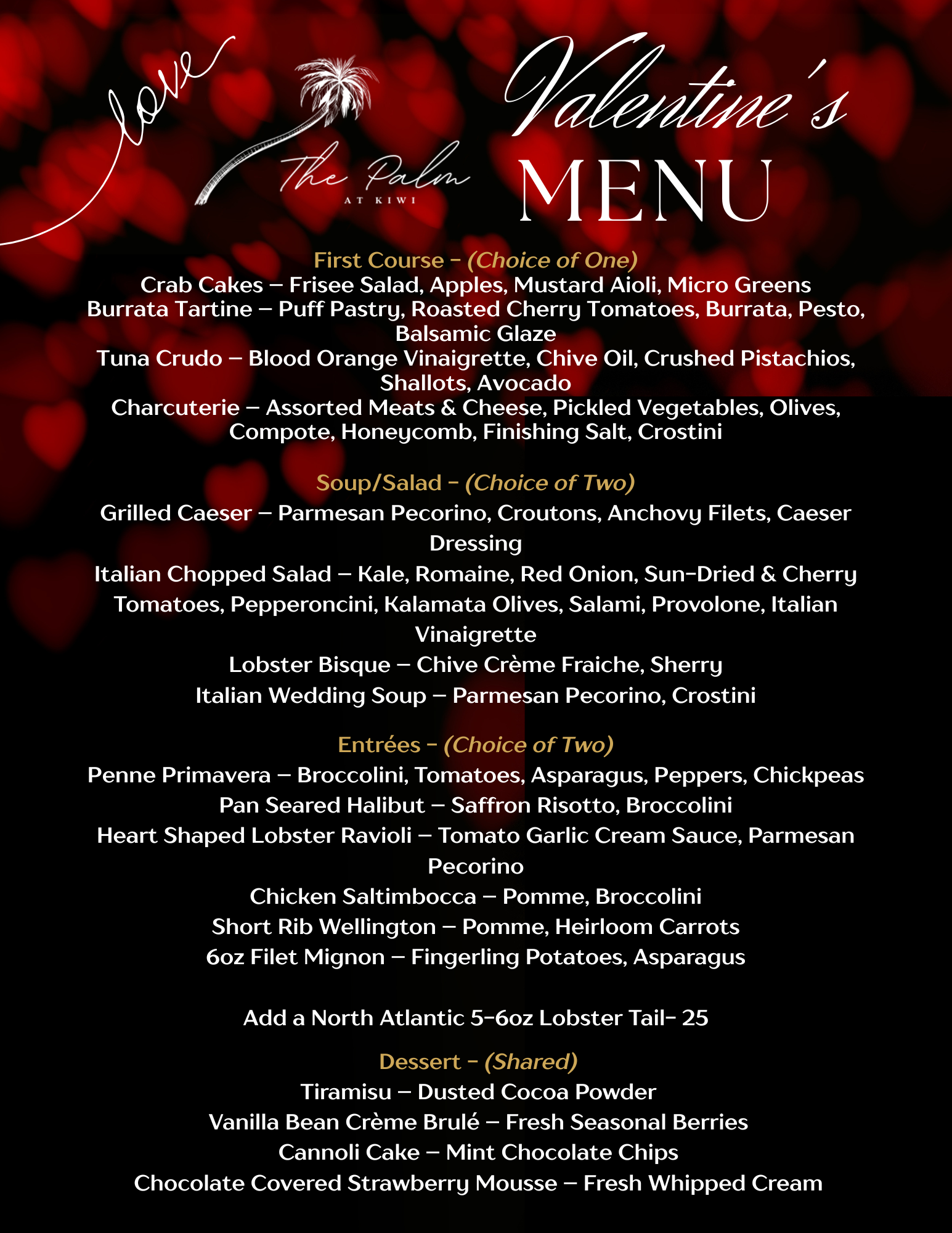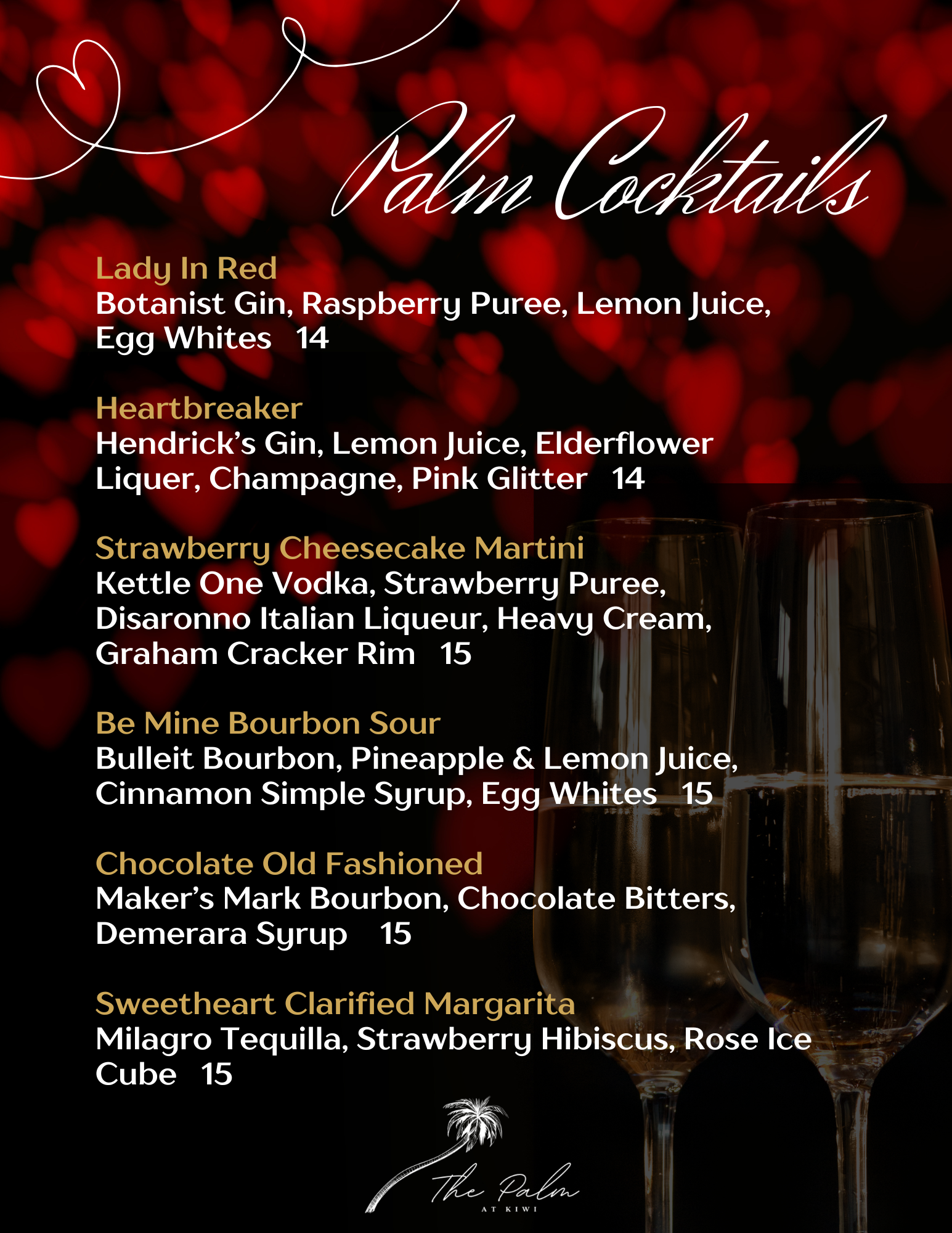 Join us in The Palm for a Valentine’s Day you won’t forget. Please reserve your table on RESY.COM or 321.404.PALM